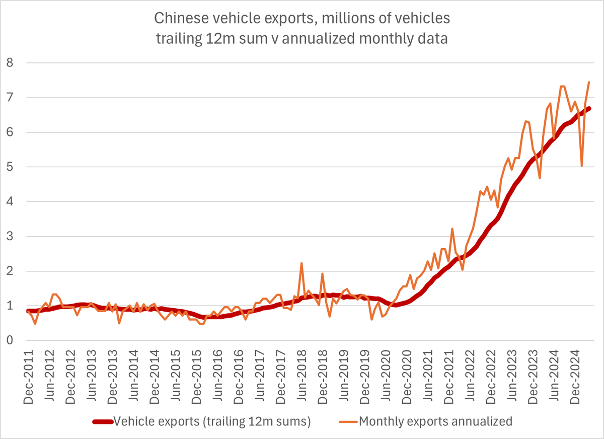 There were a lot of forecasts that the Chinese auto export wave would peak in 2024. It hasn't quite happened though. Dollar exports have plateaued. But actual exports of cars continue to creep up -- April 2025 was very strong