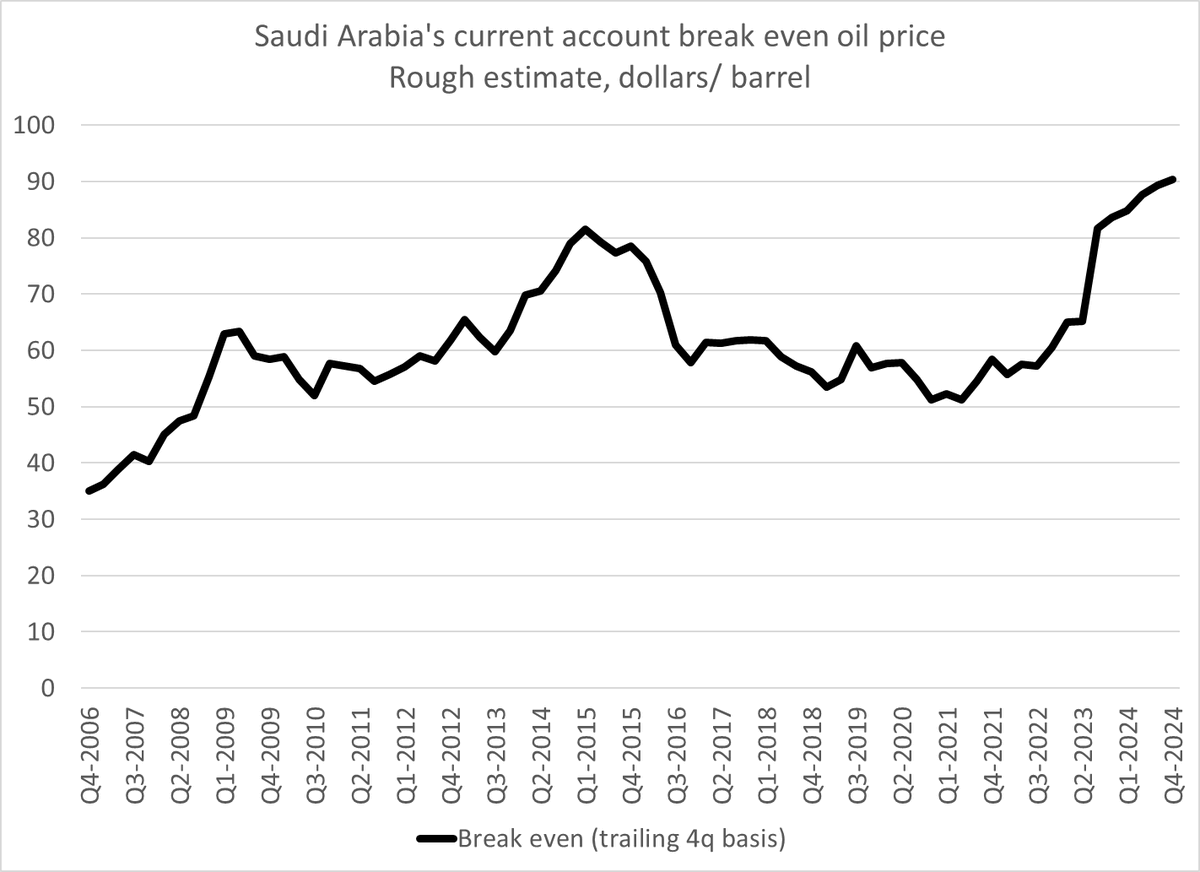 The simple reality is that the Saudis cannot fund their current levels of domestic spending and investment out of their current oil proceeds. As the chart below shows, the Saudi external (current account) break even is around $90 a barrel, way above spot oil
