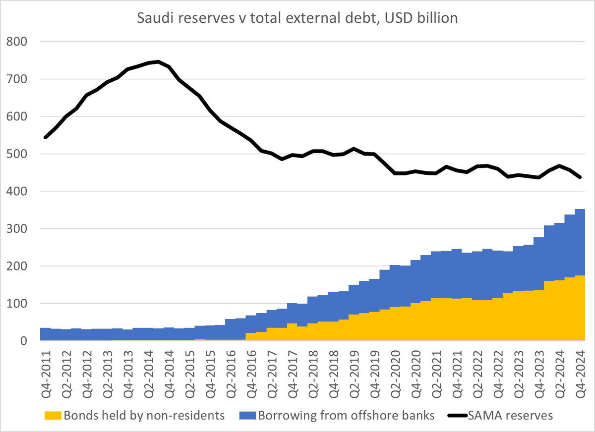 So the Saudis have to borrow from abroad (or sell down existing assets) to cover their domestic needs/ build out the line -- any additional investment in the US would have to come from selling off their stock of non US assets (or or borrowing more)