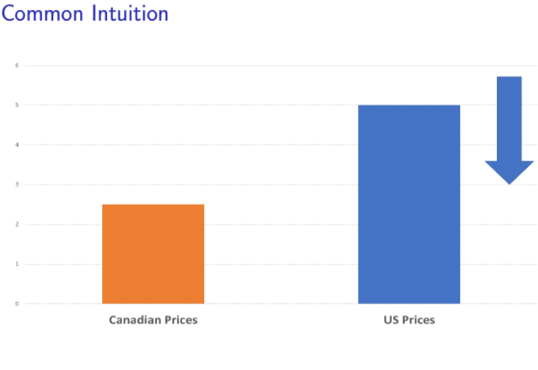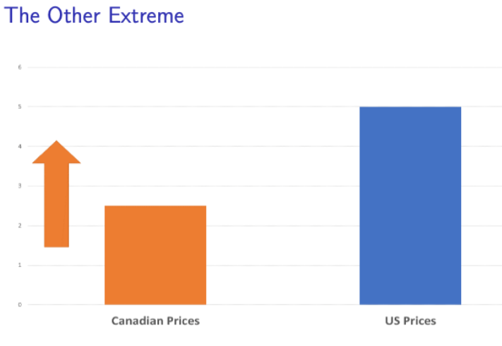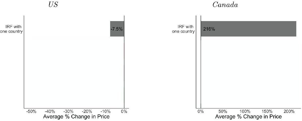 And, indeed, that's the case. We estimate a model of pharmaceutical supply and demand in the US and Canada and find that such a reference pricing rule would lower US drug prices by 7.5% while raising Canadian prices by 216%!