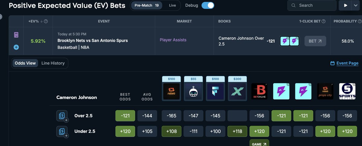 I just locked in this slip on Betr. My first pick was Cam OVER 2.5 Asts from the @OddsJam Positive EV Tool: oddsjam.com/betting-tools/…