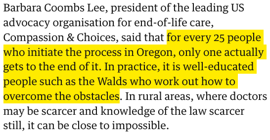 Finding compliant doctors in the maze is so hard that—according to Oregon’s main AS group—only 1 in 25 who want lethal drugs get access to them. (Guardian, July 2014)