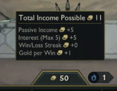 Every round (after 2-1), you receive 5 gold each turn. This can be increased by up to 5 for every 10 gold you currently have (maxed out at 50 gold).