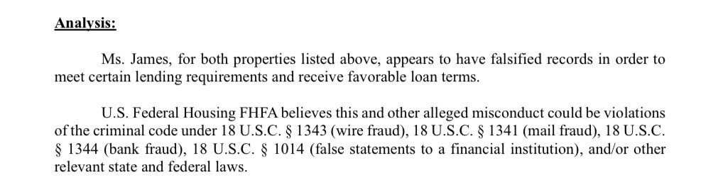 /3 FHFA’s criminal referral lays out serious allegations spanning two decades, stating AG James may have violated:
