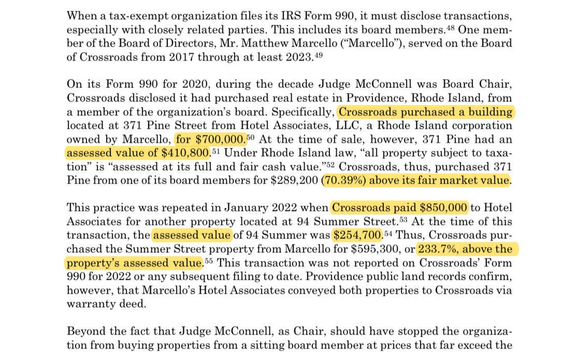 /8 While he was Chairman of the Board of Directors, Judge McConnell oversaw Crossroads Rhode Island’s purchase of two properties — both purchased from a sitting board member at prices far above fair market value.