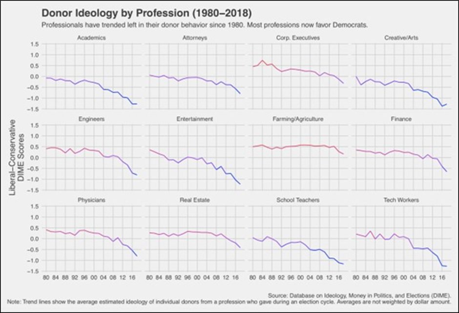 7/ The progressive dream focused on winning the young and the educated while capturing the meaning-making institutions. It worked. Attitudes held only by artists and sociologists in the 1960s spread. The professions all shifted left, as Adam Bonica shows: