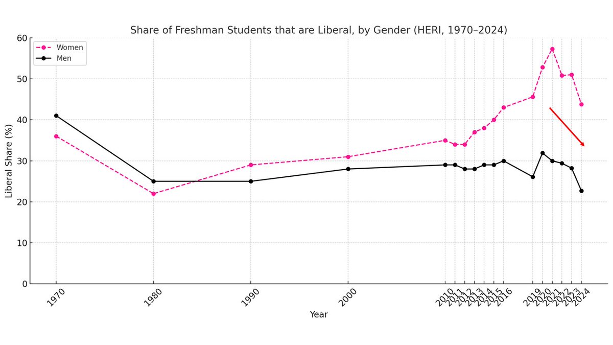 13/ The progressive dream focused on winning the young and educated. Young people are more woke on average. But a growing anti-woke tendency among formerly moderate young people has shifted young college students to the right since 2022 (HERI freshman data):