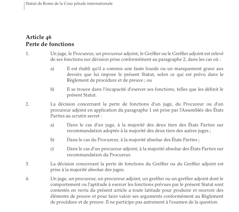 5. Pour rappel, l’article 46.2 du Statut prévoit que, s’il est établi que le Procureur a commis « une faute grave ou un manquement grave à ses fonctions », il peut être démis par l’AEP à la majorité des deux tiers des États parties présents et votants.