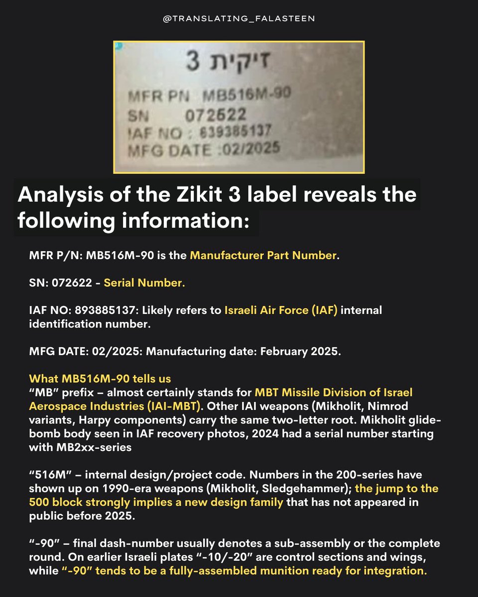 “MB” prefix – almost certainly stands for MBT Missile Division of Israel Aerospace Industries (IAI-MBT). Other IAI weapons (Mikholit, Nimrod variants, Harpy components) carry the same two-letter root. Mikholit glide-bomb body seen in IAF recovery photos, 2024 had a serial number starting with MB2xx-series