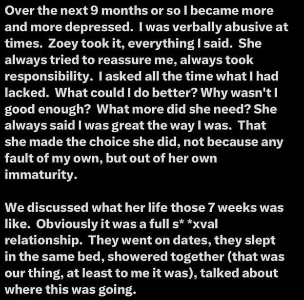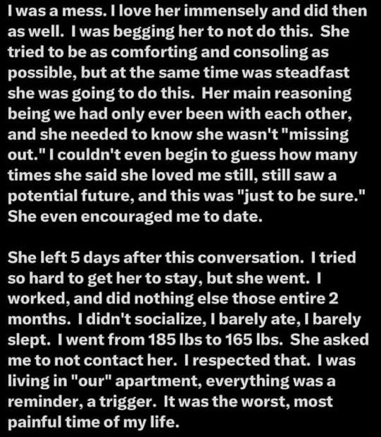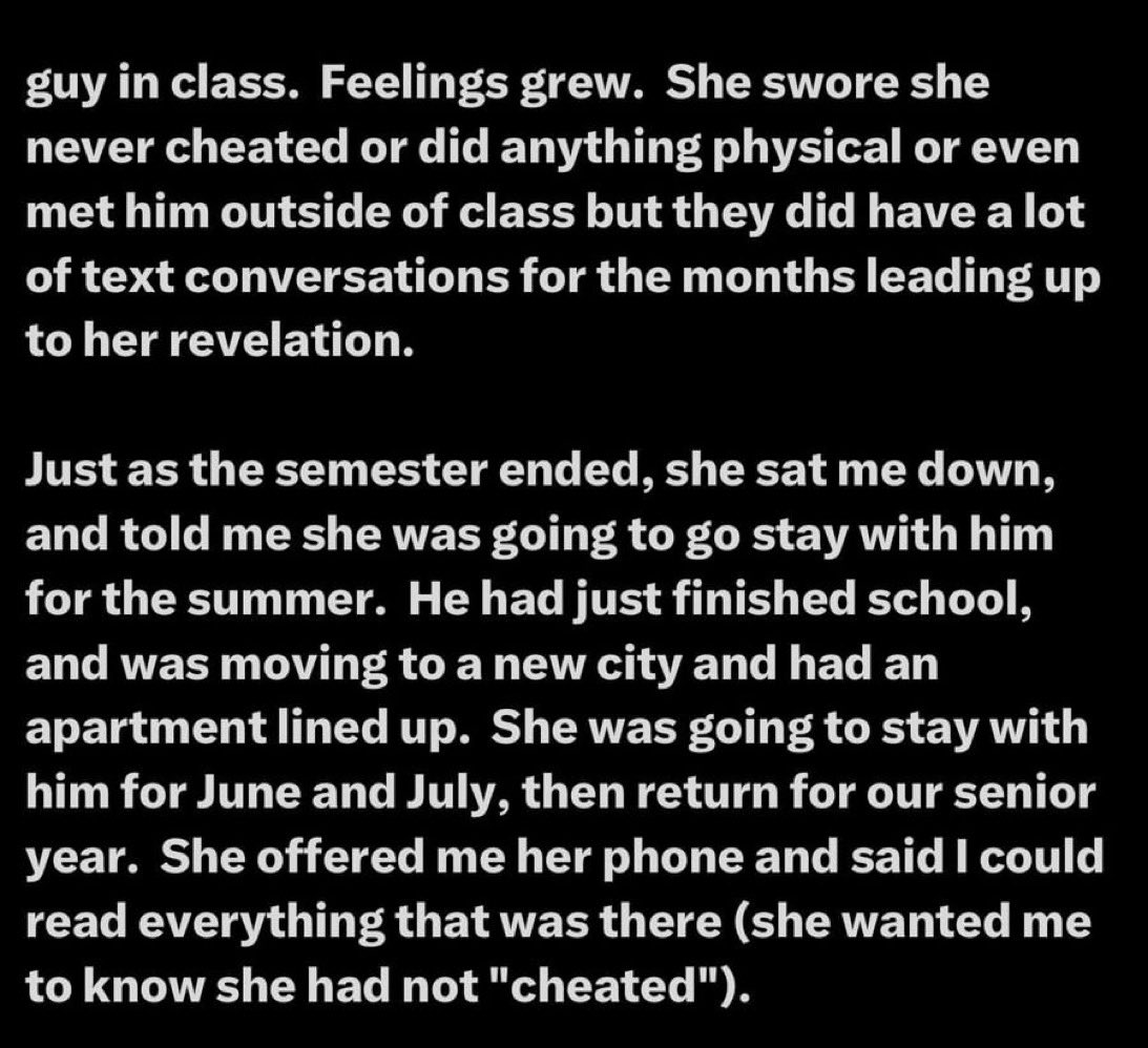 My girlfriend took a break from me and spent the summer with another guy, so she could be sure. This was a pre-meditated decision. In the spring of that year, we were both in college, and had been together 6 years at that point. I was unaware but she had been conversing with a …