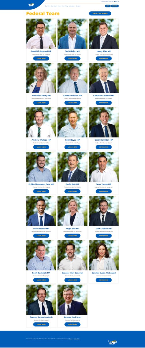 David Littleproud and & federal Qld LNP colleagues. They always campaign under that logo. In Canberra, some sit in the Nationals party room & the rest in the Liberal party room. However, the Qld LNP is a division of the Liberal Party of Australia. #auspol online.lnp.org.au/federal-team