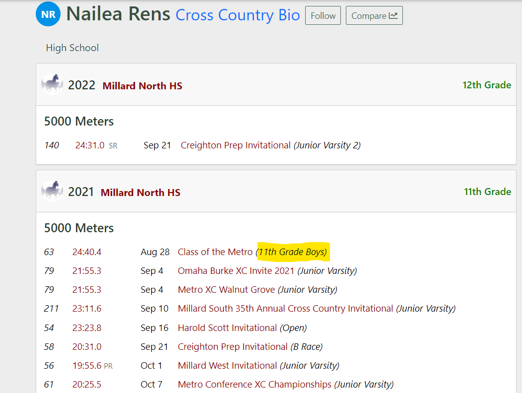 The father of "Nailea" Rens petitioned a Nebraska bill banning males from girls' teams because he wanted his son to be allowed to run on the girls' team. Rens ultimately was not allowed to do so and continued participating on the boys' cross country team.