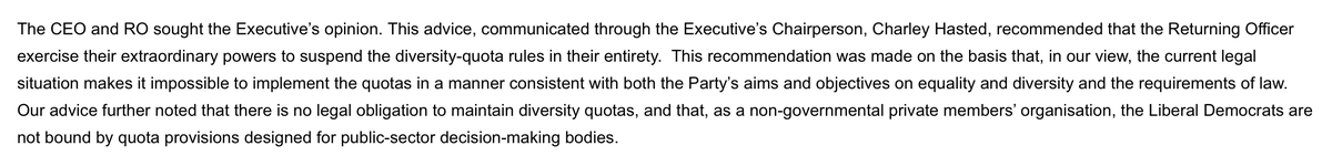 Then when @LibDems obtained legal advice agreeing the quotas were not compliant with the Equality Act and so put forward revised guidance for the elections, Plus were furious and used the entire Party machinery to get rid of the guidance. Presidential candidates, appeal panels