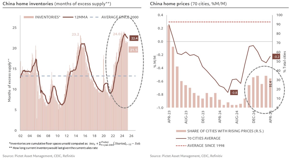 7/ … Additionally, unsold inventory has started to decline from historic highs, still far from the 13-month norm, but suggesting house prices may stabilize, with nearly a third of cities seeing price increases this month.