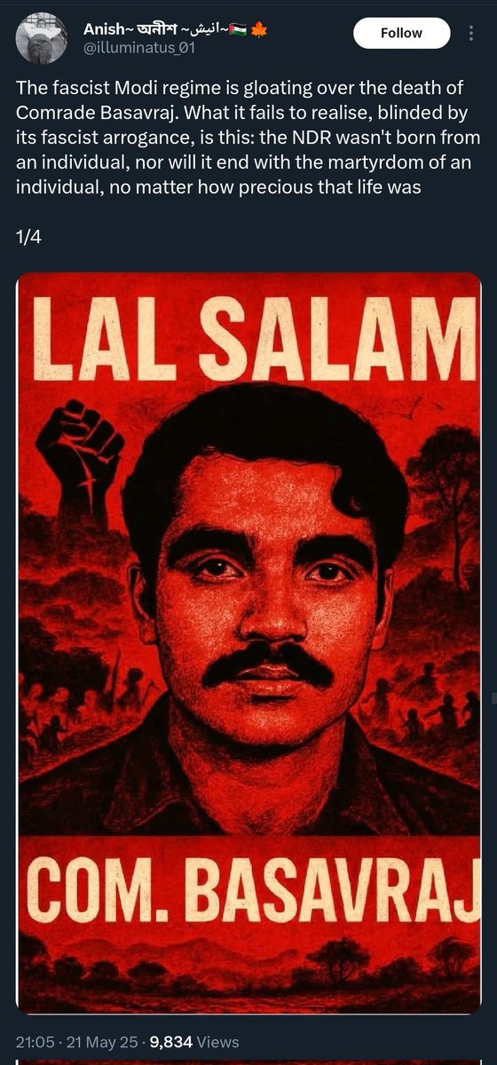 Maoist supreme commander and General Secretary Basavaraj with a prize of 1.5 crores on his head, a B.Tech. from NIT Warangal, trained by the LTTE in guerrilla warfare and active for nearly 50 years, was neutralized in a 50-hour-long operation.