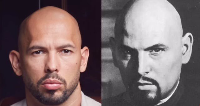 Let’s begin where the enchantment begins: the image. Let’s begin with the most immediate enchantment: appearance. Tate, like Church of Satan founder Anton LaVey, cultivates a calculated look.