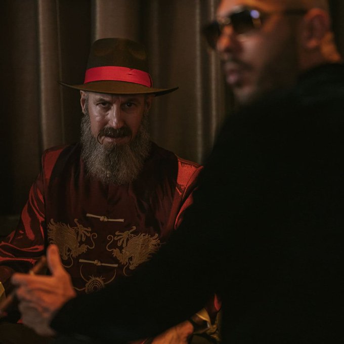 Shaved head, goatee, intense gaze, commanding posture. Every inch of his persona is meant to scream control, danger, power.