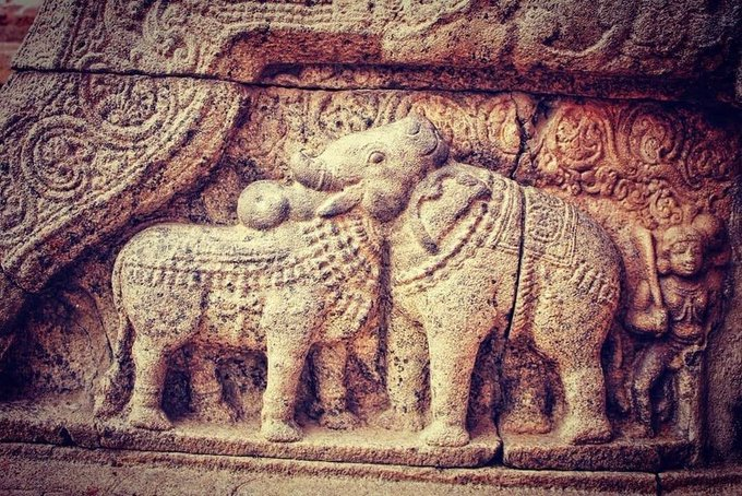 A 900-year-old exquisite bas-relief of an elephant and a bull sharing a common head is part of the Airavatesvara Temple, India built by Chola King Rajaraja II