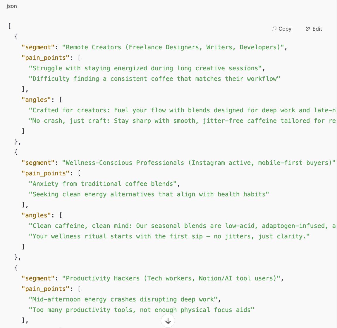 "Act as a market analyst. Using {customer_data_summary}, identify 3 key audience segments, their top 2 pain points each, and suggest 2 messaging angles per segment. Output as JSON with “segment”, “pain_points” and “angles” fields."