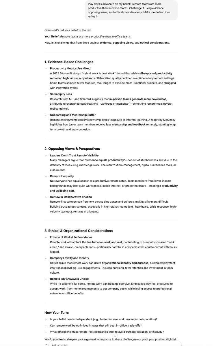 “Play devil’s advocate on my belief: ‘{insert belief or strategy you hold}’. Challenge it using evidence, opposing views, and ethical considerations. Make me defend it or refine it.”