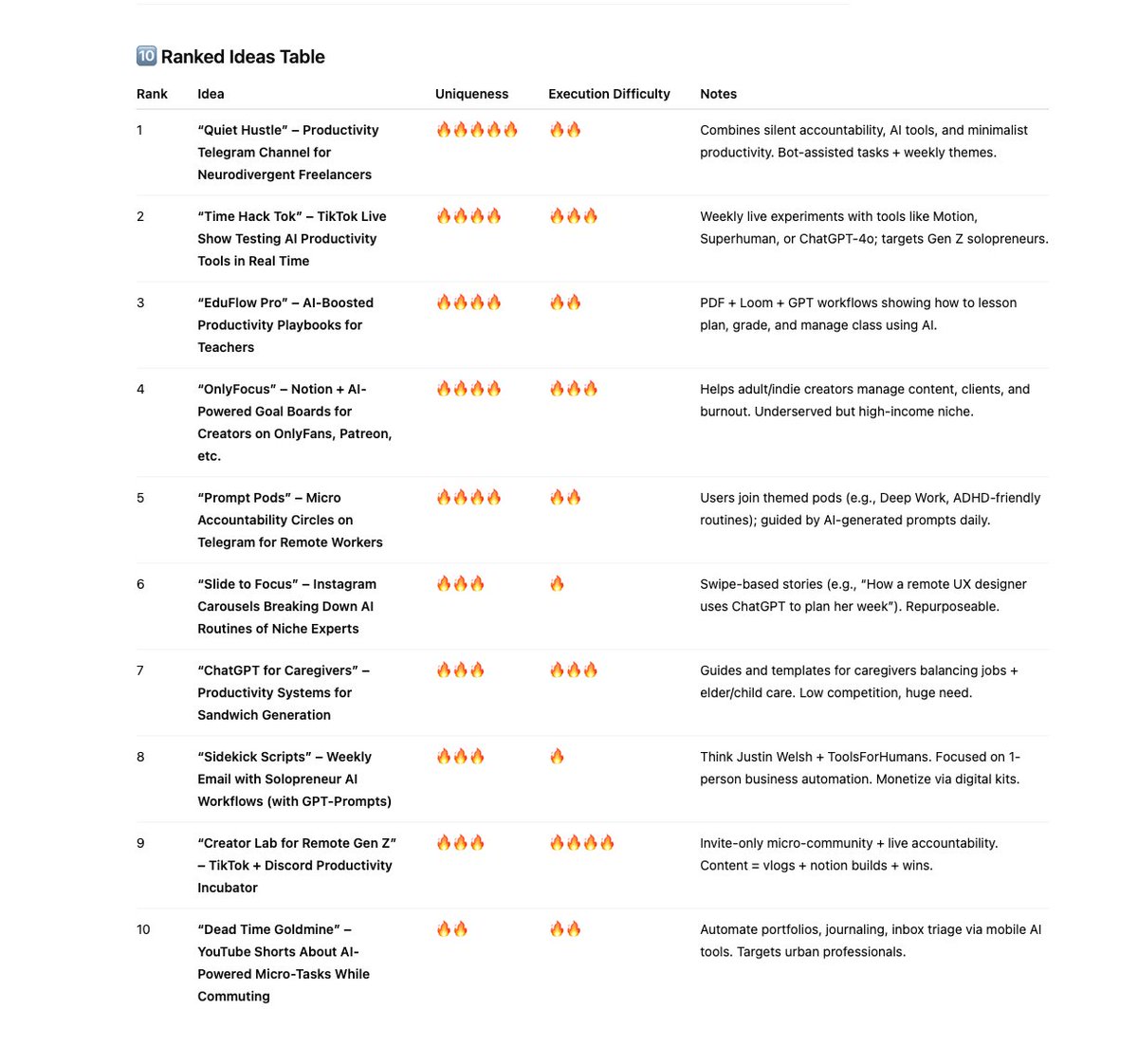 “Give me 10 non-obvious content or product ideas in the {niche} space that combine current trends, underserved audiences, and emerging platforms. Rank them by uniqueness and execution difficulty.”