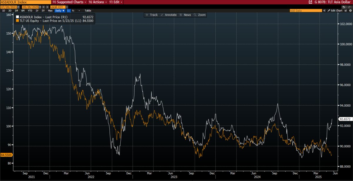 18/ Global bond yields are going higher and Asia is showing signs of repatriation as the Asian Dollar index rises while TLT makes new lows this week. Moody's downgrades US. The current system is broken and investors are looking for diversification. BTC