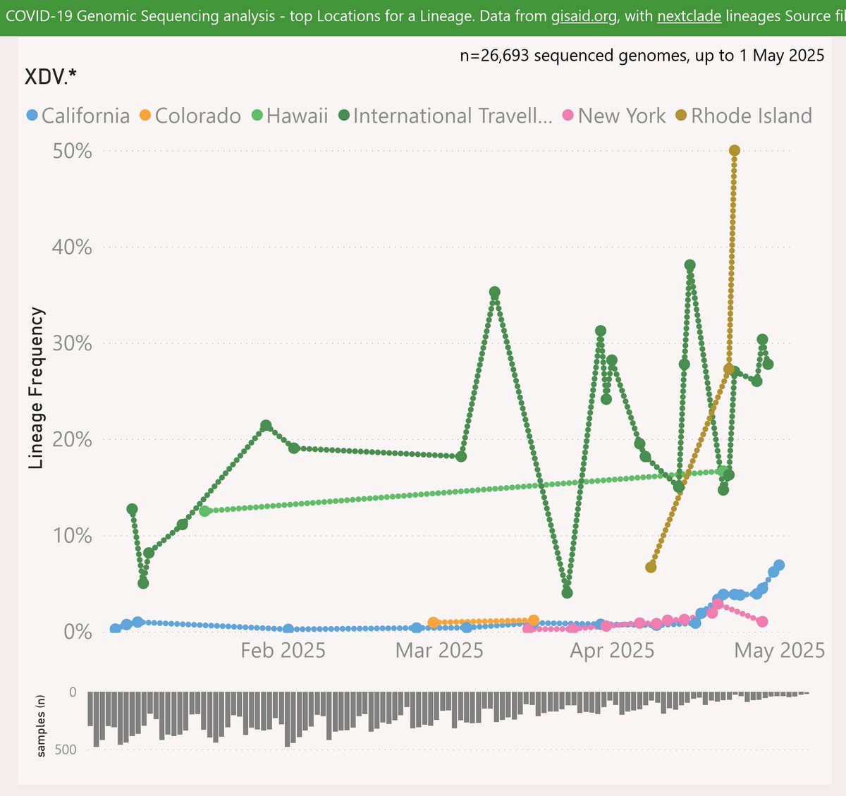 The XDV.* variant (led by NB.1.8.1) has mainly been reported among the International Traveller samples, at around 20-40% frequency. It rose to 50% in Rhode Island recently, but samples sizes from there are very thin.