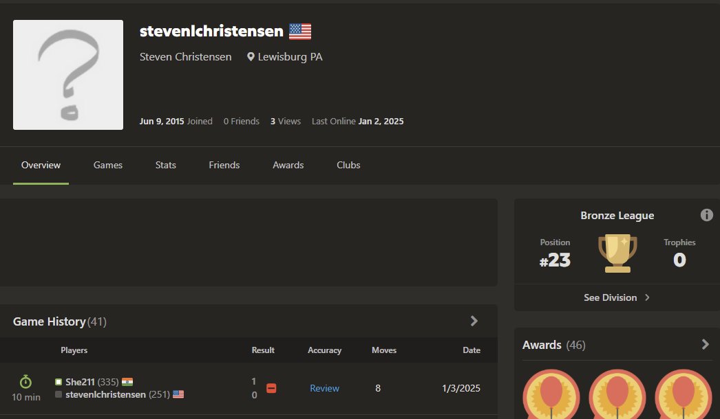 Actually it looks like Guy has a second Chess (dot) com account associated with guy.christensen@gmail.com where his location is set to "Palestine".