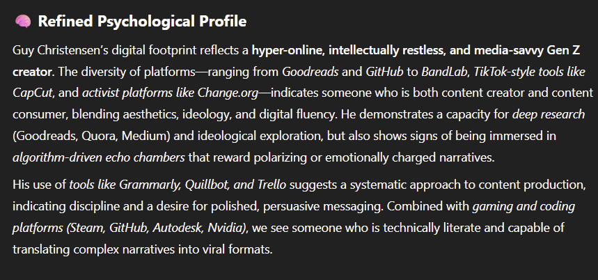 If we do a ChatGPT psychological profile (just for fun, totally not scientific!) we see some striking revelations which many who feel threatened by his violent rhetoric online would likely agree with.