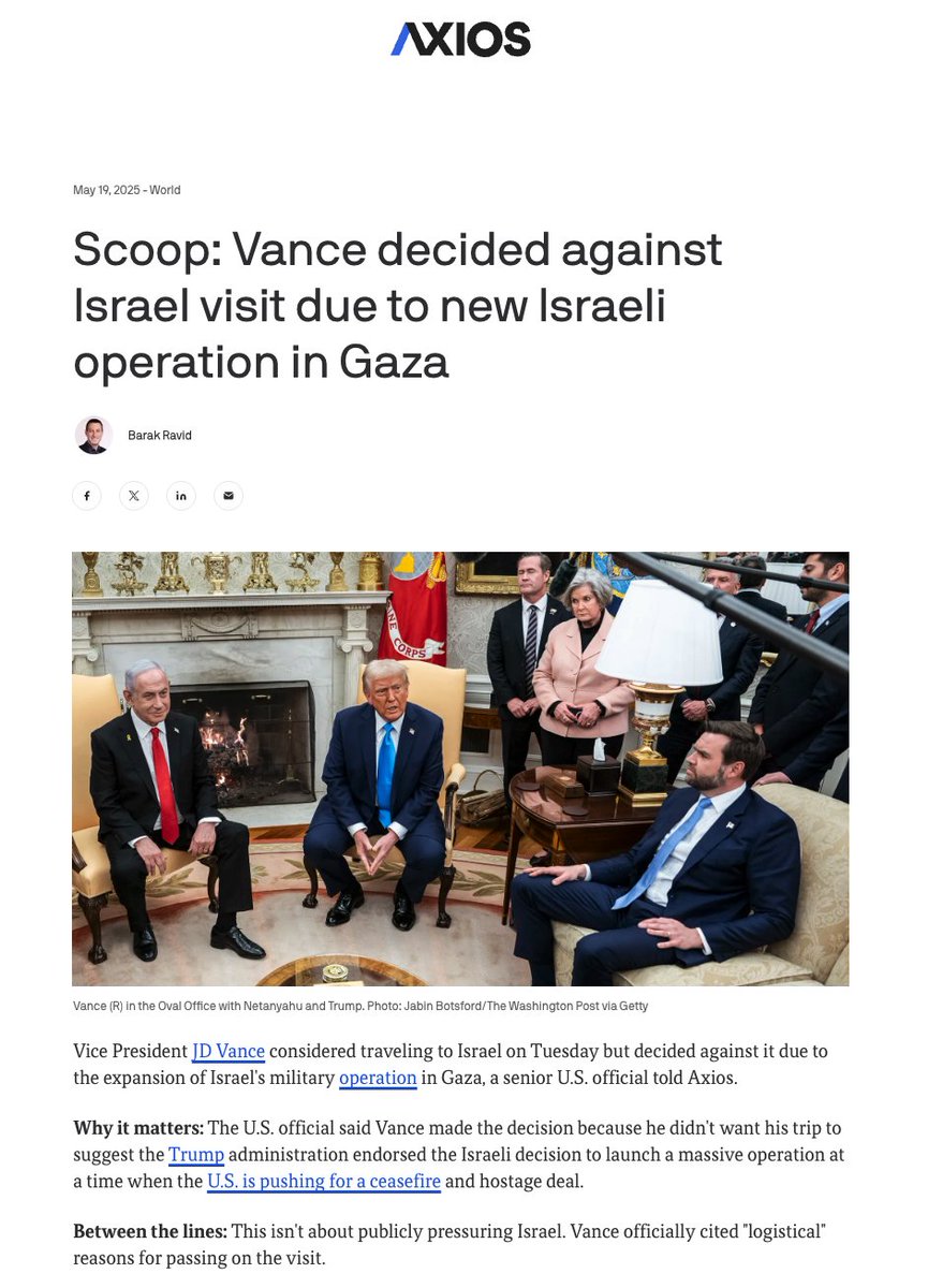 از طرف دیگر طبق دو خبر دیگر پایگاه اکسیوس در ۱۹ و ۲۰ می، ترامپ به نتانیاهو پیام فرستاده که جنگ غزه را «جمع کند». ونس هم که قصد داشته سفری به اسرائیل داشته باشد، آنرا لغو کرده است، امری که به مخالفت وی با تصمیم نتانیاهو برای گسترش جنگ در غزه نسبت داده شده است./۳