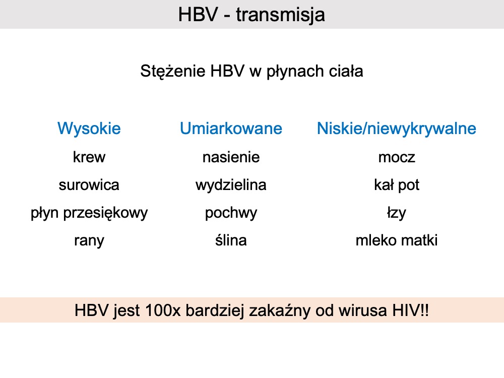 HBV szerzy się wyłącznie przez krew i płyny ustrojowe, w tym nasienie i wydzielinę pochwy co wskazuje na transmisję drogą seksualną. We krwi, surowicy oraz płynie przesiękowym rany jest go najwięcej. Warto podkreślić, że HBV jest 100x bardziej zakaźny niż wirus HIV.