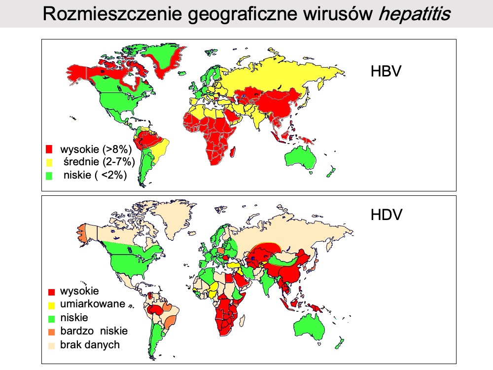 dokładnie w tych samych krajach występuje HDV. Dlaczego? Bo to wirus satelitarny HBV i może się replikować tylko w tych komórkach, w których jest HBV. To jednocześnie oznacza, że osoby zaszczepione przeciwko HBV są także chronione przed HDV.