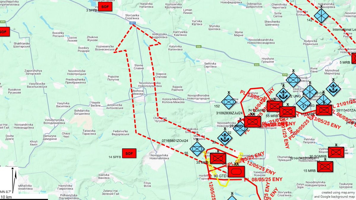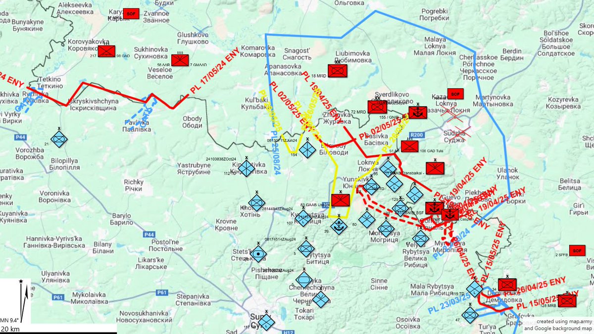 Comando Operacional Oeste: liberó Radkivka (23/05) lo que corta una de las dos líneas de comunicaciones a Kupiansk (la P 79 al sur fue cortada en octubre de 2024 y al norte ahora en Radkivka quedando disponible solo la P07)