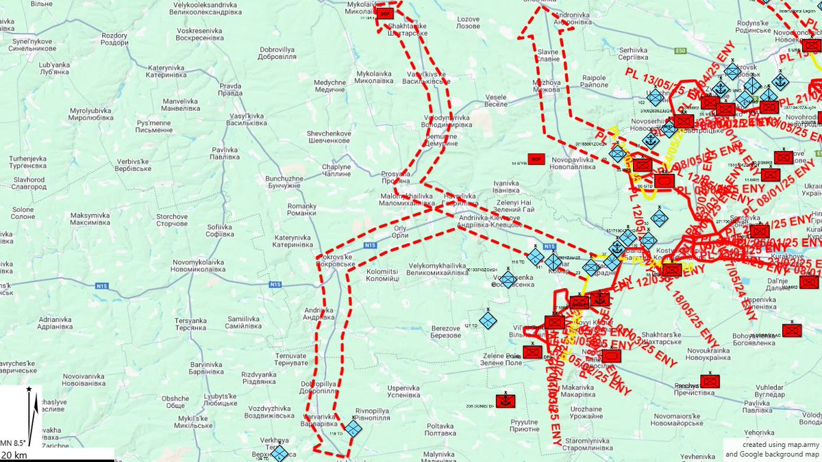 Al sur la 20 División Motorizada de la Guardia liberó Novoolenivka (19/05) y Nova Poltavka (22/05) cortando nuevamente la ruta entre Prokrovsk y Konsytantybivka.