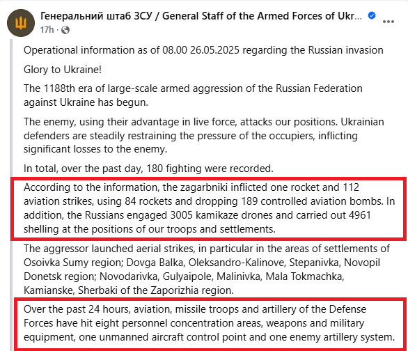 Rusia hoy realizó 112 salidas aéreas y lanzó 189 bombas, la aviación, la artillería y los misiles ucranianos batieron 8 (ocho) blancos. ¿Rusia hace mayor cantidad de salidas aéreas y tira más bombas pero ucrania hace operaciones efectivas? ¿es joda, no?