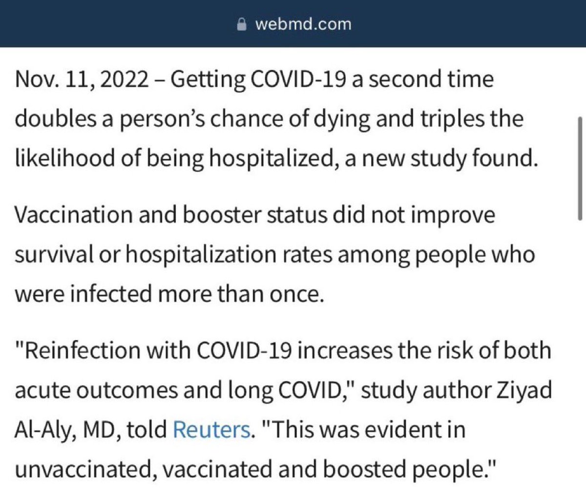 2022: “Vaccination and booster status did not improve survival or hospitalization rates among people who were infected more than once.” blogs.the-hospitalist.org/content/repeat…