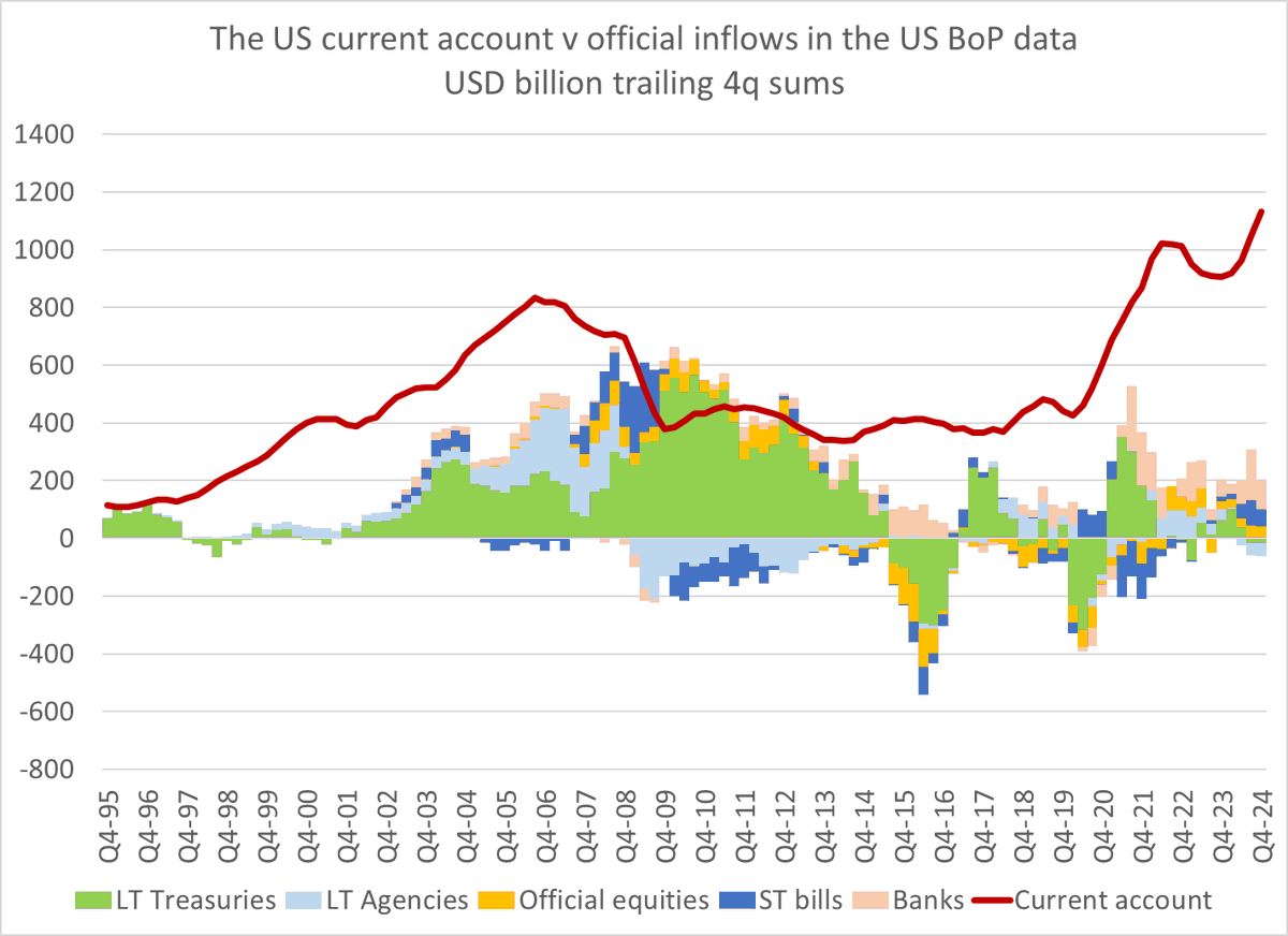 Now the CW (even more outside the US than inside the US) attributes the financing of the US external deficit to the dolllar's reserve currency "status" even tho reserve accumulation hasn't driven the Asian surplus flow over the last 10 years