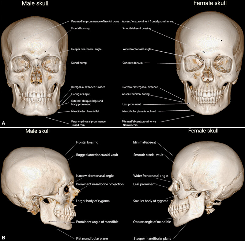 Men have uniquely shaped skulls: prominent brow ridges, larger mastoid processes, and sagittal keels