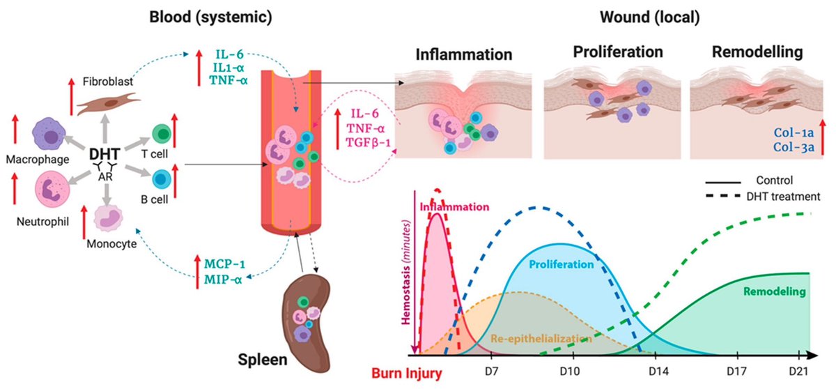 Mitochondrial dysfunction impairs follicular healing, causing chronic inflammation and fibrosis. DHT amplifies the immune response and fibrosis, but isn't the root cause.