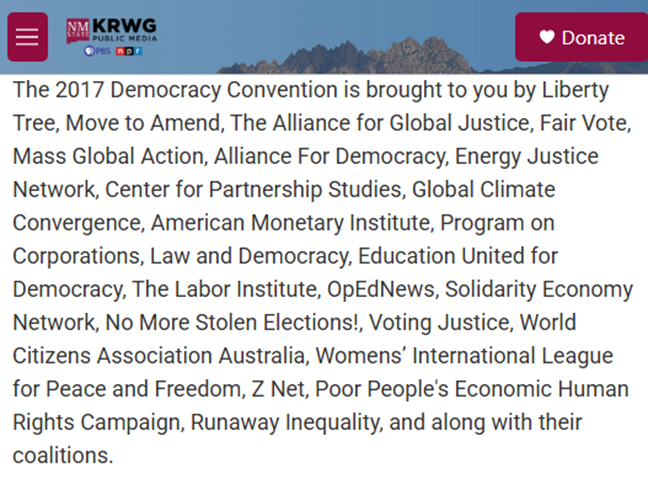 Minnesota's Democracy Convention was convened by groups including Liberty Tree Foundation for a Democratic Revolution, Alliance for Democracy, Fair Vote, and Alliance for Global Justice.