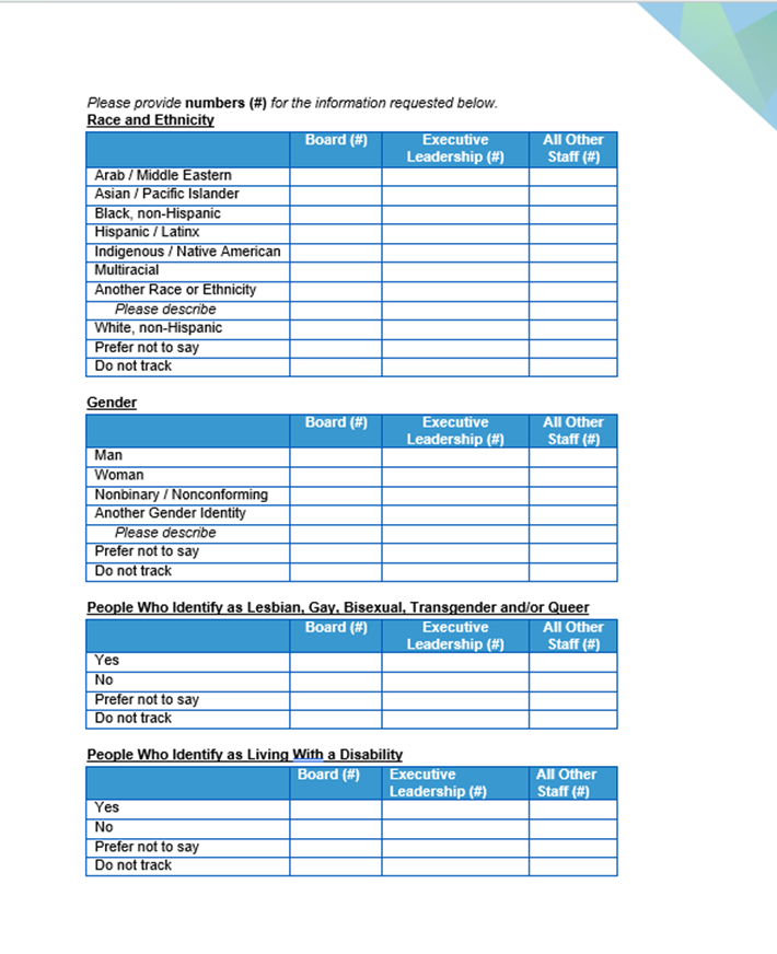 CHF grant applicants must demonstrate their commitment to "advancing equity" by identifying board members, staff, and their communities based on racial, sexual (including transgender and/or queer), and disability status. The application makes it clear that the information will affect the likelihood of funding.