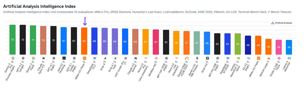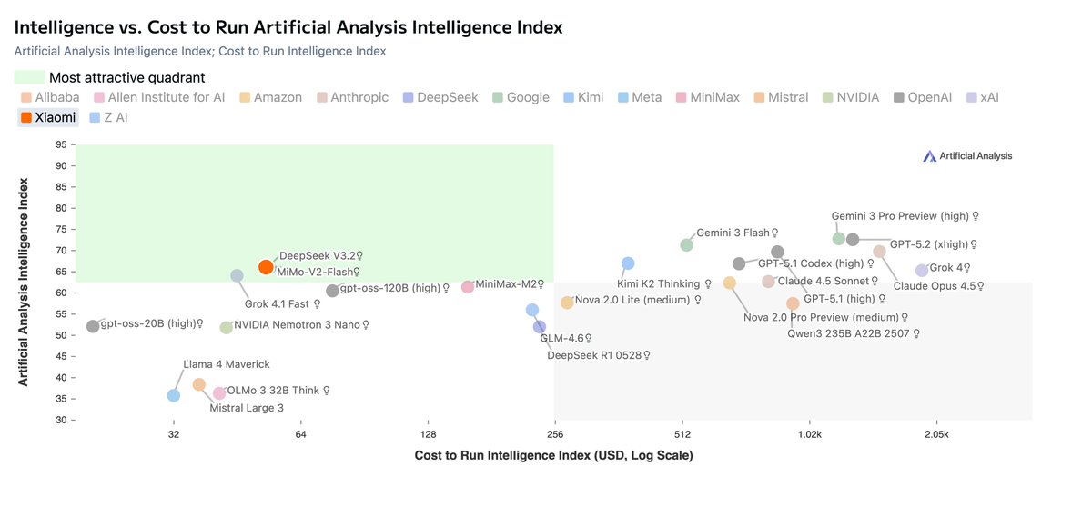 Xiaomi has just launched MiMo-V2-Flash, a 309B open weights reasoning model that scores 66 on the Artificial Analysis Intelligence Index. This release elevates Xiaomi to alongside other leading AI model labs.