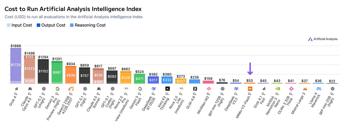 ➤ Cost competitive: The full Artificial Analysis evaluation suite cost just $53 to run. This is supported by MiMo-V2-Flash’s highly competitive pricing of $0.10 per million input and $0.30 per million output, making it particularly attractive for cost-sensitive deployments and large-scale production workloads. This is similar to DeepSeek V3.2 ($54 total cost to run), and well below GPT-5.2 ($1,294 total cost to run)