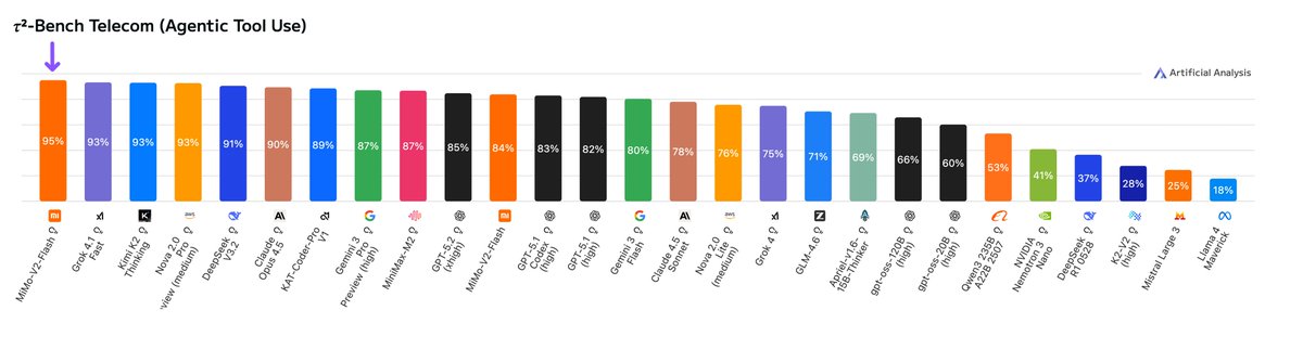 ➤ Strengths in Agentic Tool Use and Competition Math: MiMo-V2-Flash scores 95% on τ²-Bench Telecom and 96% on AIME 2025, demonstrating strong performance on agentic tool-use workflows and competition-style mathematical reasoning. MiMo-V2-Flash currently leads the τ²-Bench Telecom category among evaluated models