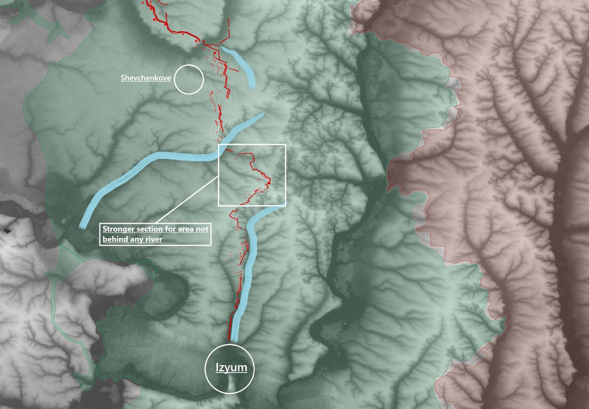 1. The defensive line itself is built on positions that make sense to defend. That is, behind rivers, on dominant hills and on topographical chokepoints. Moreover, it's anchored by "urban pins". In the case of the photo, Izyum and Shevchenkove.