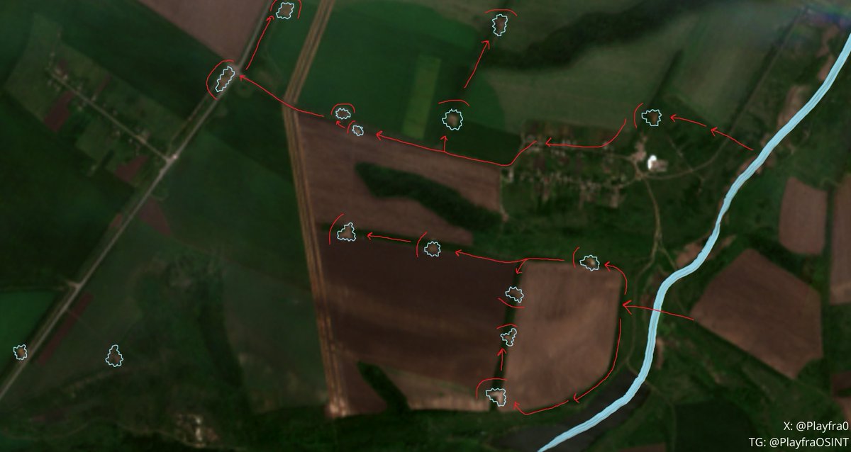 Until now, the Russians advanced well to Uspenivka, effectively exploiting the very well-built Ukrainian trenches (that were simply abandoned by Ukraine) to accumulate their own manpower and transfer it without Ukrainian FPV threat. Once they reached the Yanchur river, it was imperative for them to force it immediately to exploit an almost complete lack of any Ukrainian organized defense effort, but to do this it was essential to secure the farm at 47.770945, 36.454224 (east of Novomykolaivka), and the small part of Novomykolaivka located east of the Yanchur river (1 single line of houses) at 47.771161, 36.447422.