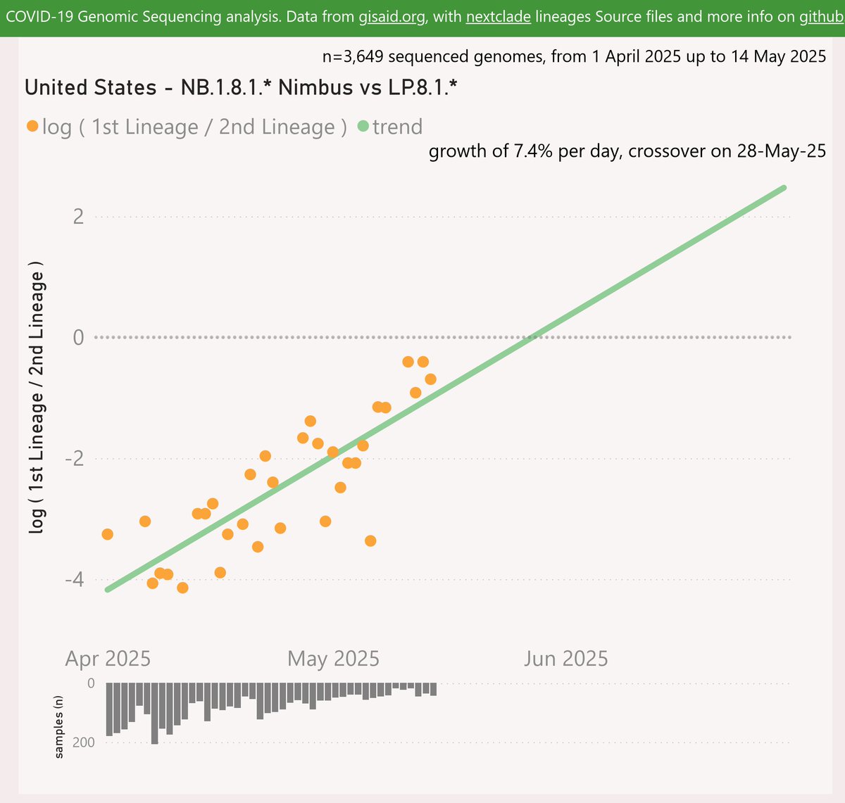 Globally, the NB.1.8.1 "Nimbus" variant is showing a strong growth advantage of 6.3% per day (44% per week) over the LP.8.1.* variant, with a crossover in mid- May.