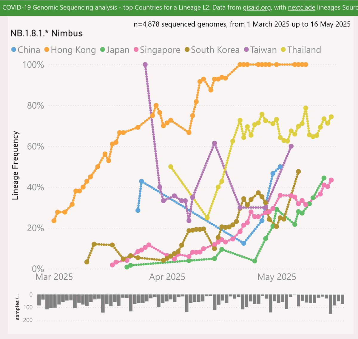 The first reported wave of NB.1.8.1 "Nimbus" was in Hong Kong, rising to 100% frequency. It has also shown sustained growth in other countries across the region.