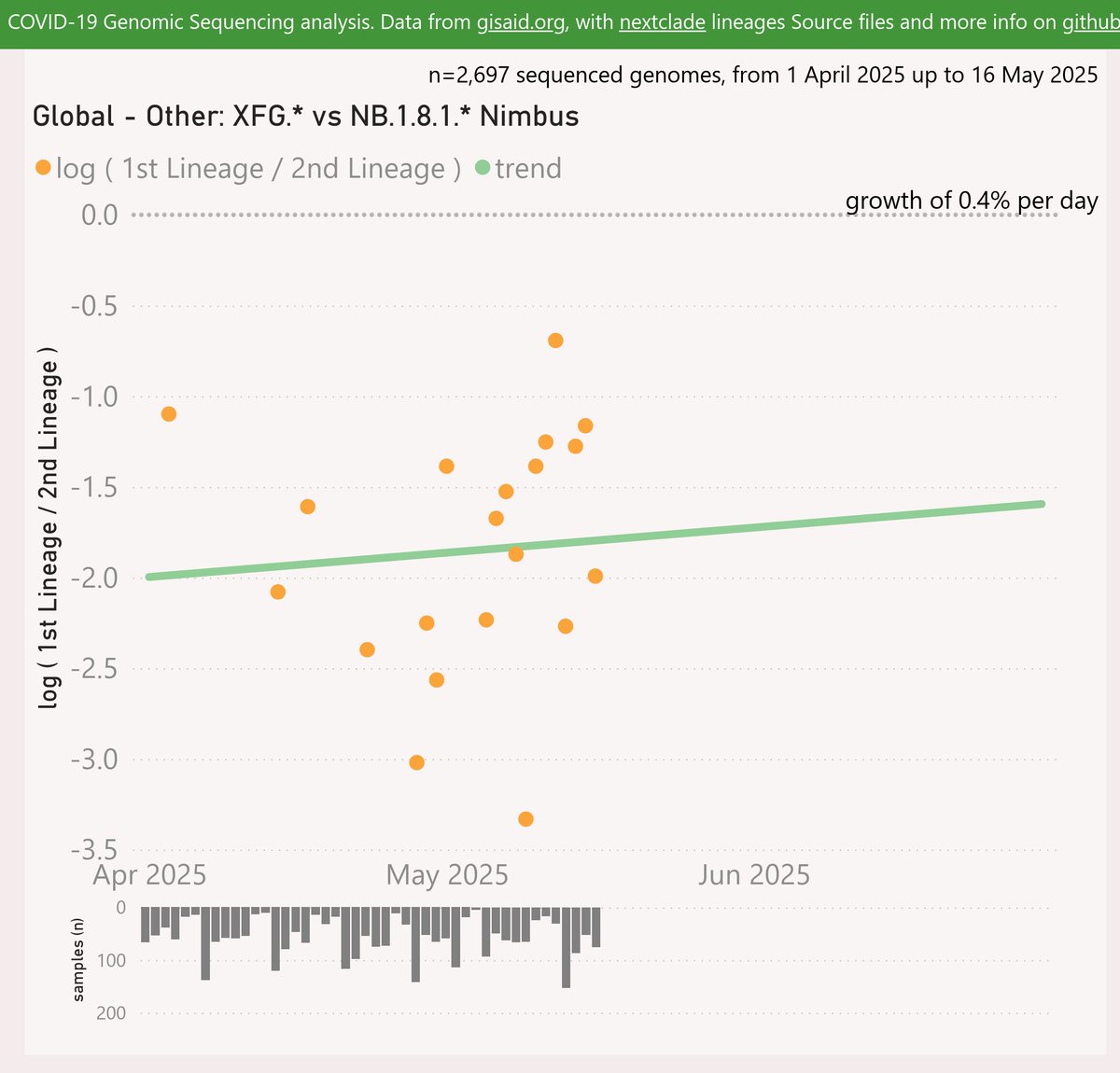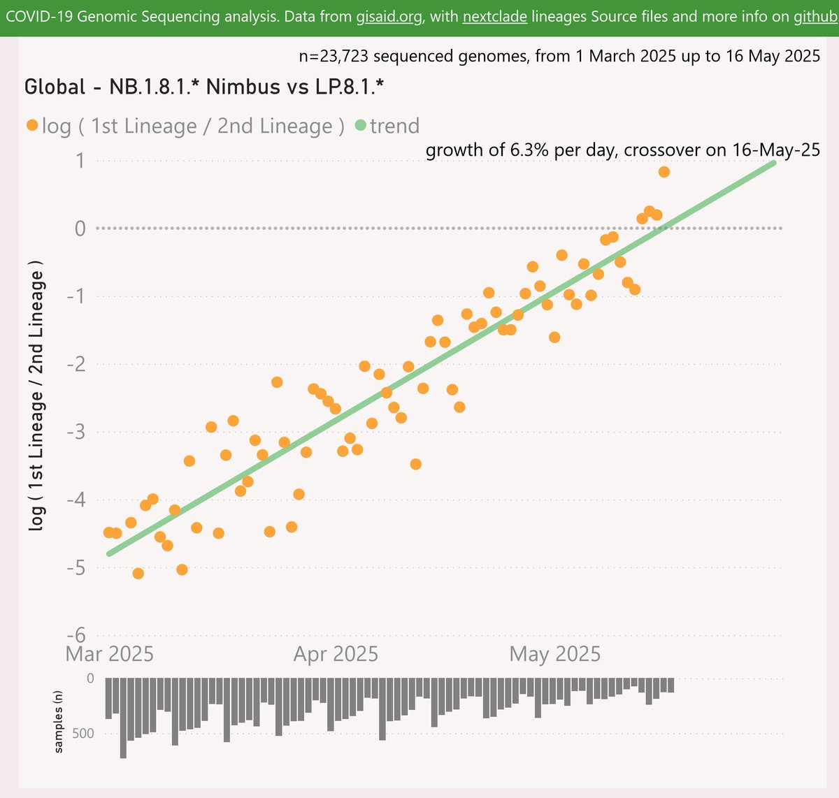 Globally, the NB.1.8.1 "Nimbus" variant is showing a strong growth advantage of 6.3% per day (44% per week) over the LP.8.1.* variant, with a crossover in mid- May.