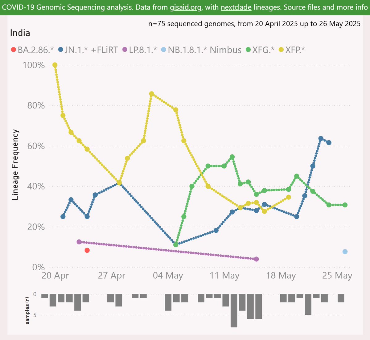 When India itself resumed sharing samples recently, XFP appeared to be dominant there from at least mid-April. So XFP is presumed to have originated in India, during the many months when there was no sample data shared.